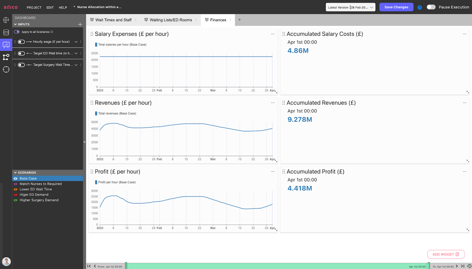 Below we can see the financial implications of the decision to match nurses to the required targets. Accumulated salary costs are £2.43 million pounds higher by the end of the simulation period. However, the hospital's profit is not as negatively affected thanks to an increase in revenues, due to more patients being treated, which counteracts the higher salary costs.