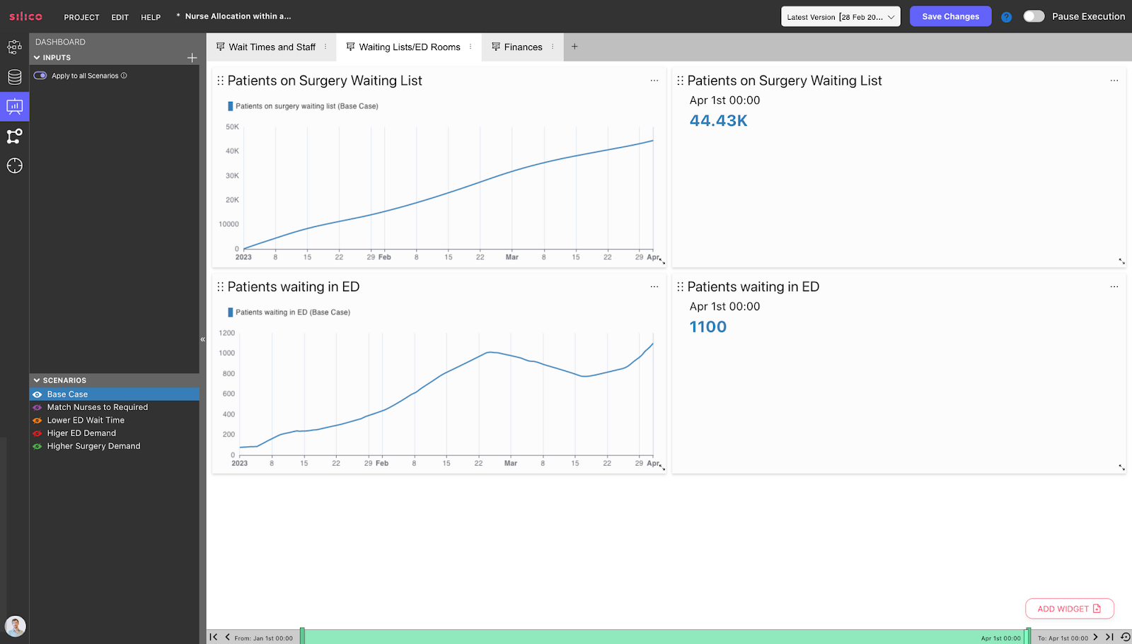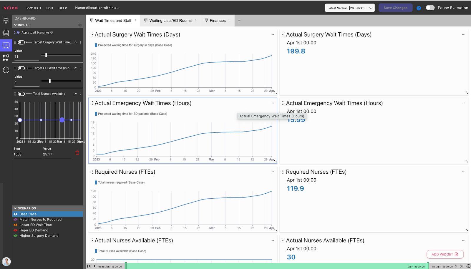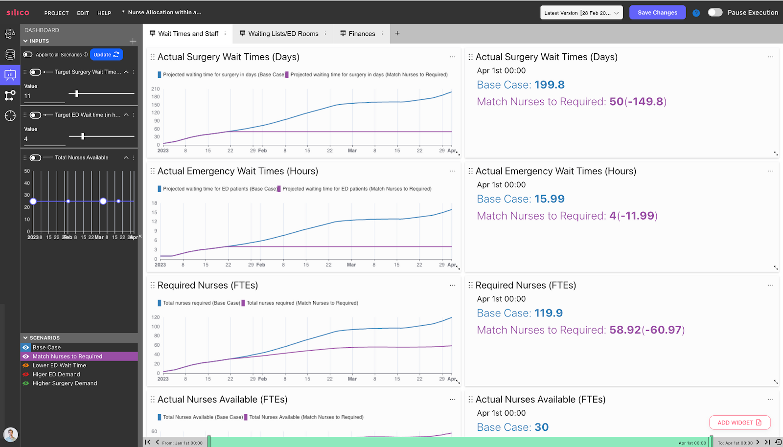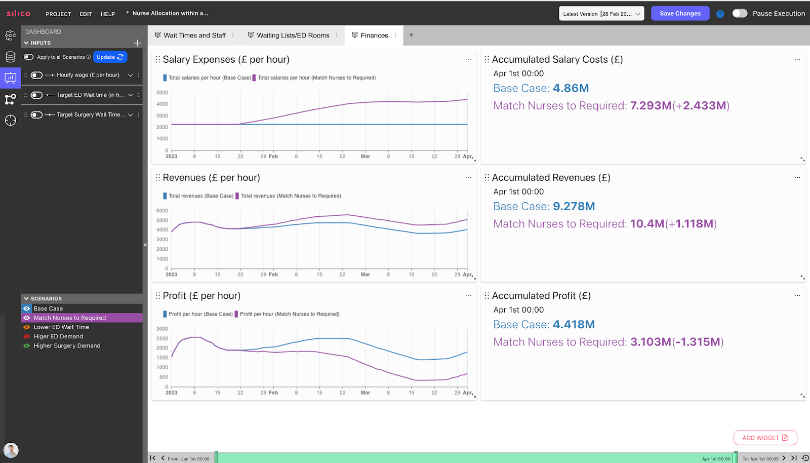 Let’s test another decision. Let’s say an NHS budget allocator wants to see what the cost would be to achieve the target times for ED and surgery of this hospital. To do this, we’ve created the purple Scenario in which the nurses will equal the nurses required to achieve target times.
